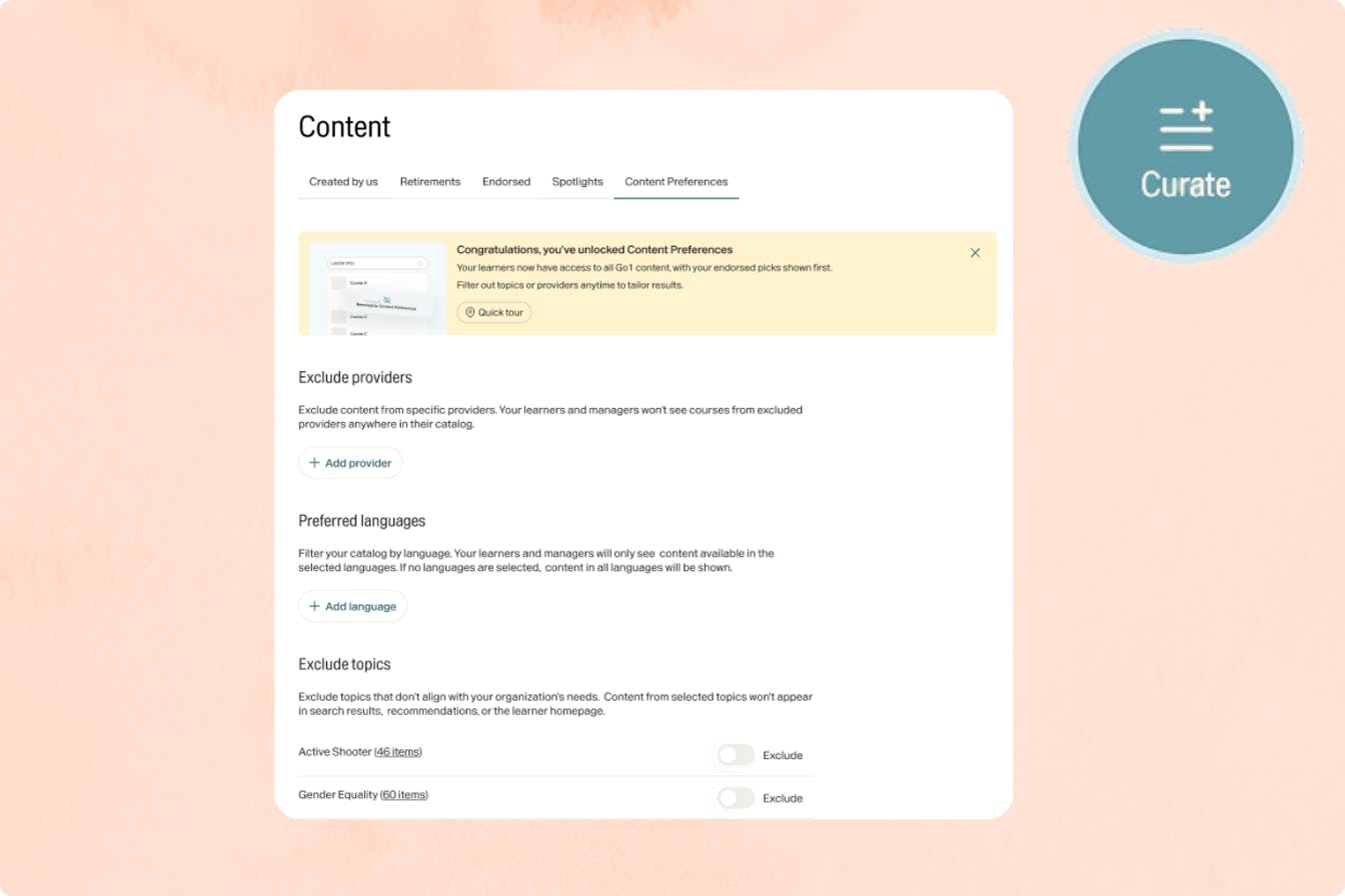 Set global preferences for providers and languages to tailor results while keeping Go1 open for discovery.