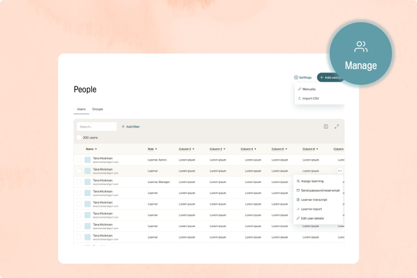 - Work smarter at scale – assign learning, send reminders, or update user details across multiple people at once