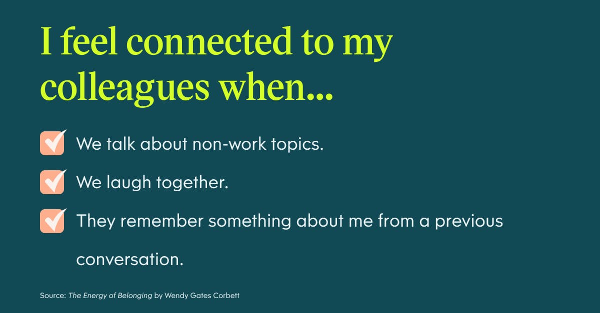Connection is the lifeline of employee engagement. To feel like they belong, employees must feel connected to both their colleagues and the organization as a whole. They need to feel seen and heard, and believe that their coworkers are genuinely interested in them.