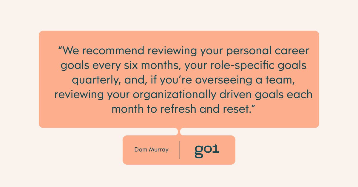 Further, setting goals isn’t a one-time event; it’s an ongoing process of refinement and adjustment. As you grow and evolve in your career, your priorities may shift, and new opportunities may arise. Therefore, it’s essential to regularly revisit and reassess your goals to ensure they're still relevant and aligned with your career path. We recommend reviewing your personal career goals every six months. Your role-specific goals quarterly, and, if you’re overseeing a team, review your organizationally driven goals each month to refresh and reset.