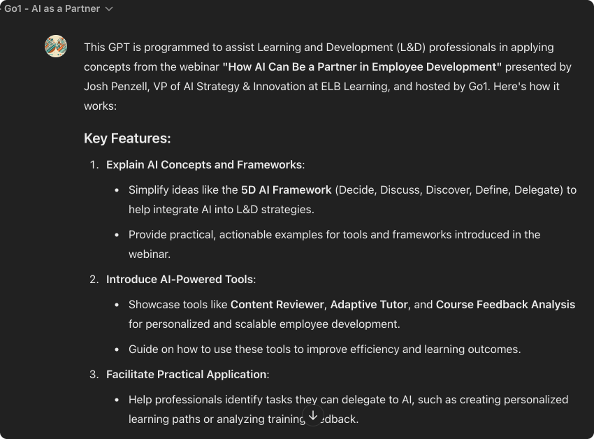 When your team is trained and confident in their AI skills, productivity advancements will begin to flow in and new use cases will emerge. And Josh has you one step ahead with this custom GPT he's programmed to assist L&D professionals in applying concepts from this webinar!