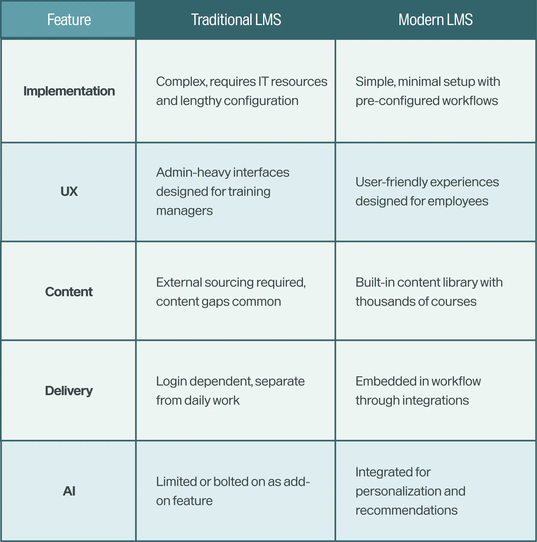 Traditional systems were built to manage and track training compliance. Modern systems are built to drive adoption and skill development. The difference shows up in implementation speed, user experience, content availability, delivery methods, and AI integration.