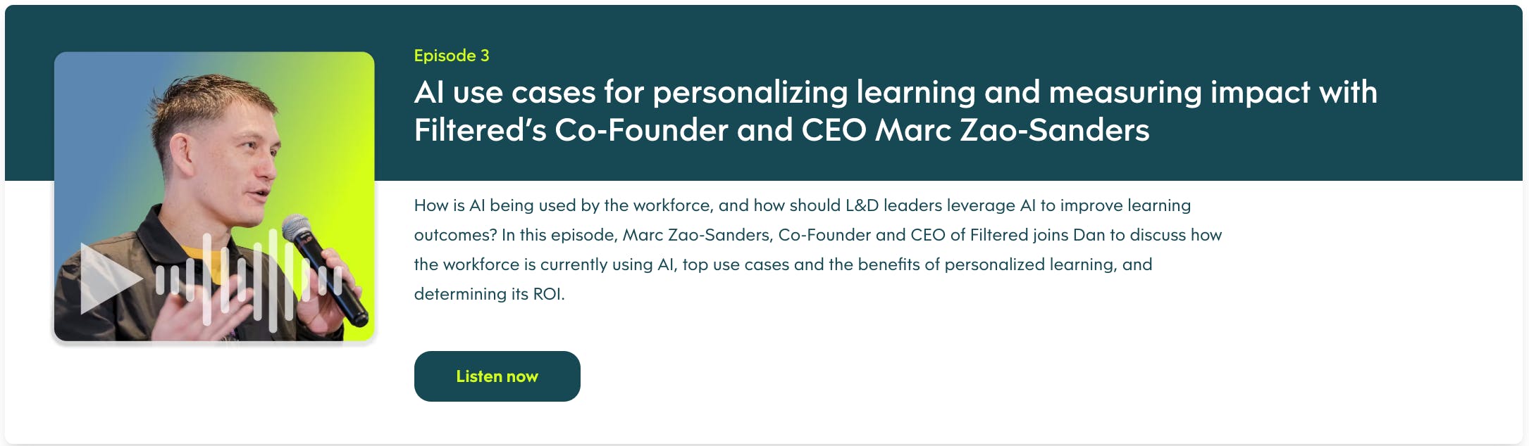 For more on the topic of incorporating storytelling into business strategies and employee training, be sure to check out L&D in 20 Episode 3: AI use cases for personalizing learning and measuring impact with Filtered’s Co-Founder and CEO Marc Zao-Sanders