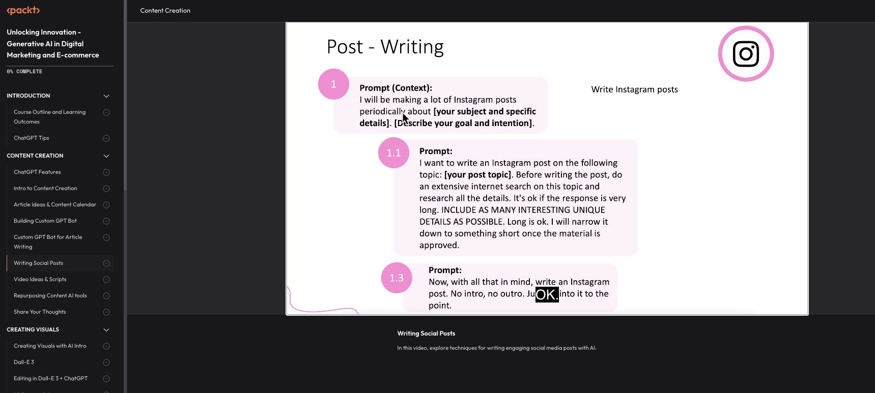 This course extends into the realms of advertising, email campaigns, e-commerce, and personalized marketing with AI. Starting with an introduction to the course, you'll delve into the functionalities of ChatGPT, learn how to generate creative content ideas, develop engaging articles, and manage a content calendar.