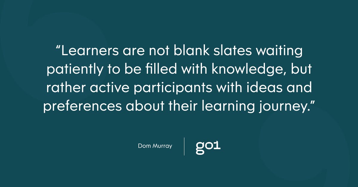 Thus, rather than designing generic, one-size-fits-all training and pushing it out to your learners, a learner-centred approach means taking a more active, considered, and bespoke view of learning. Learners are not blank slates waiting patiently to be filled with knowledge, but rather active participants with ideas and preferences about their learning journey.