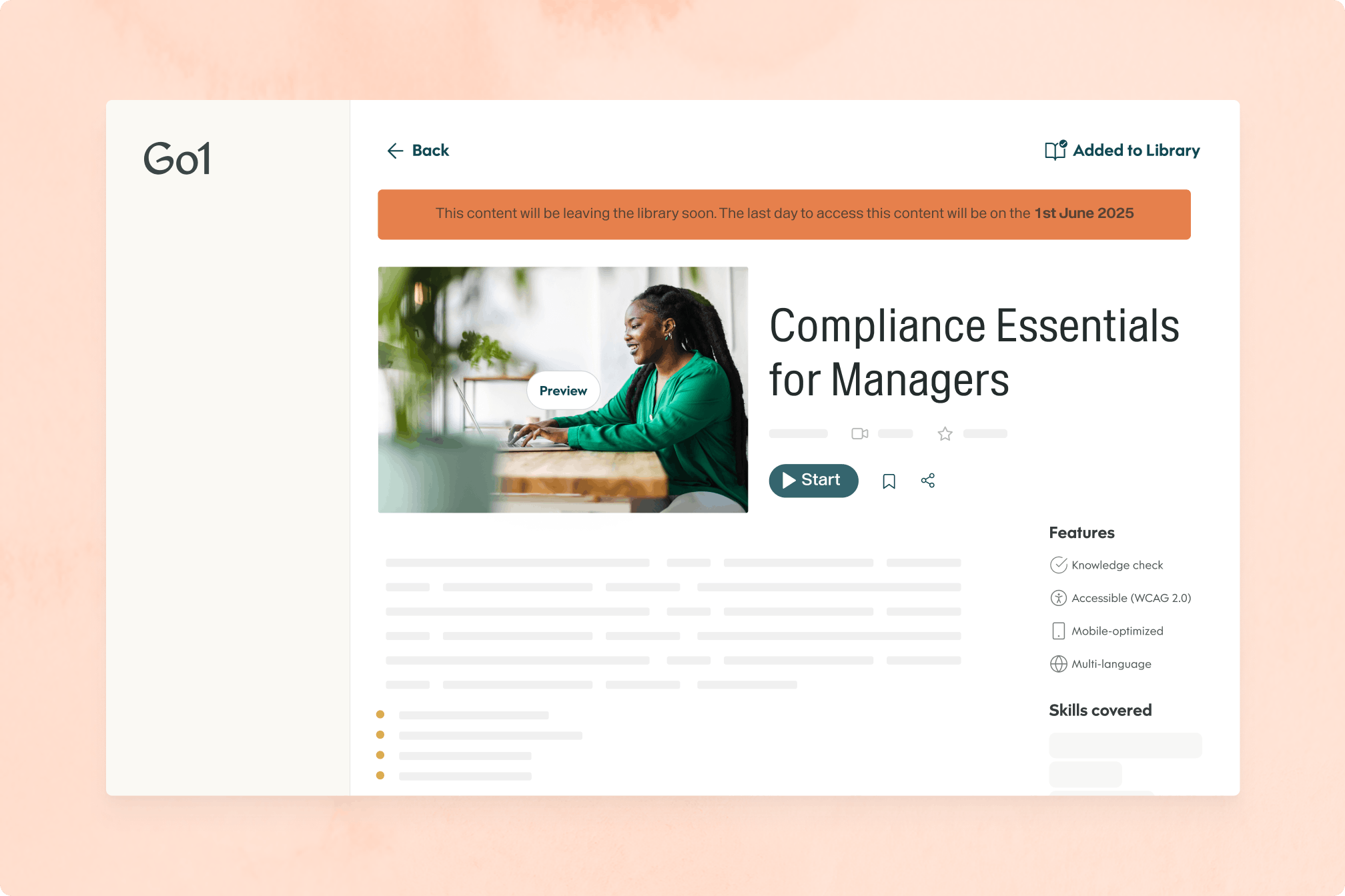 Go1 AI makes finding, curating, and delivering the right learning easier. Break down needs by skill, close gaps faster, and spend less time on admin.