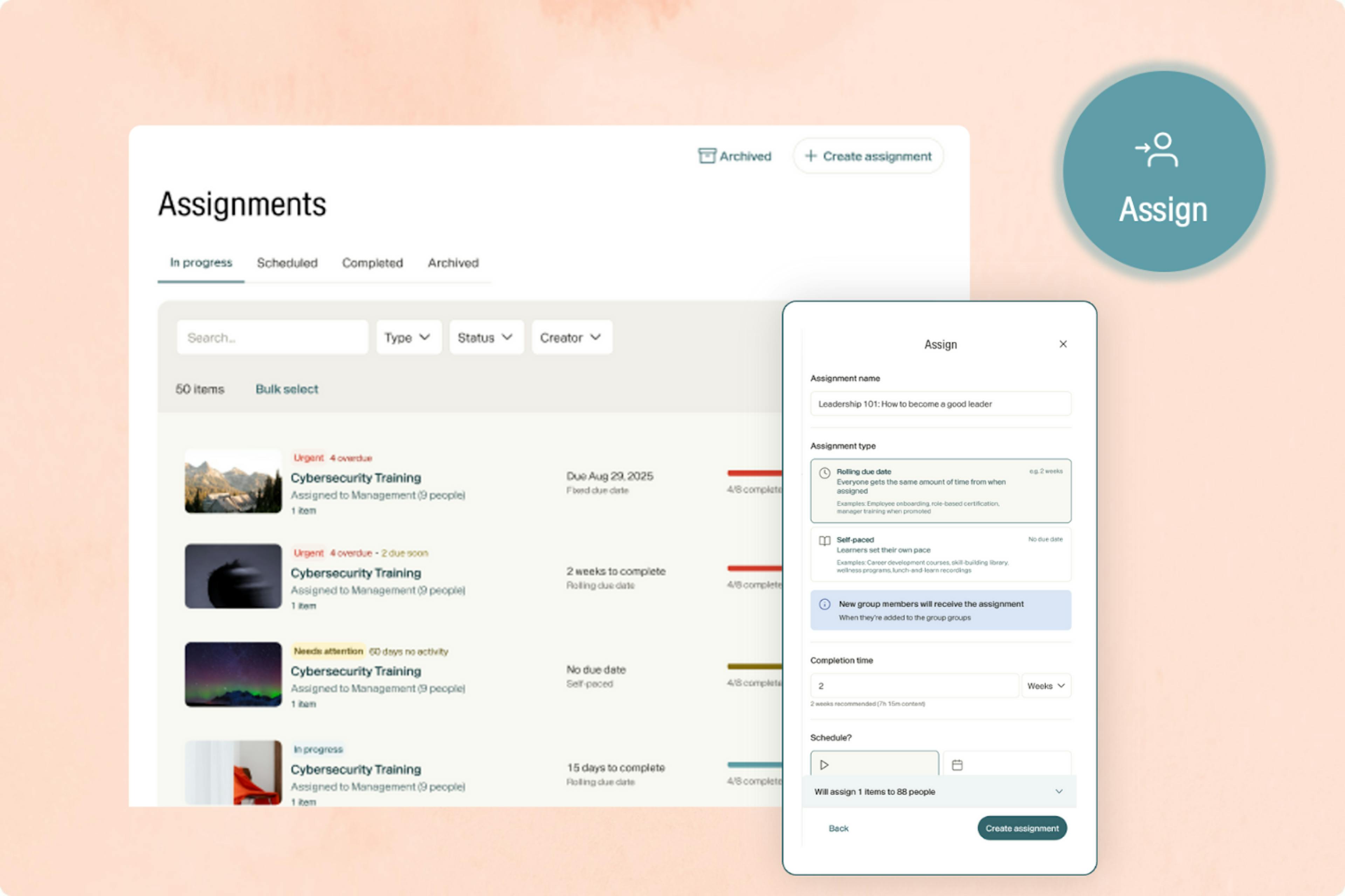 - Track progress instantly - Admins and managers can see all active and scheduled assignments in one dashboard, with clear visibility on completion and due dates