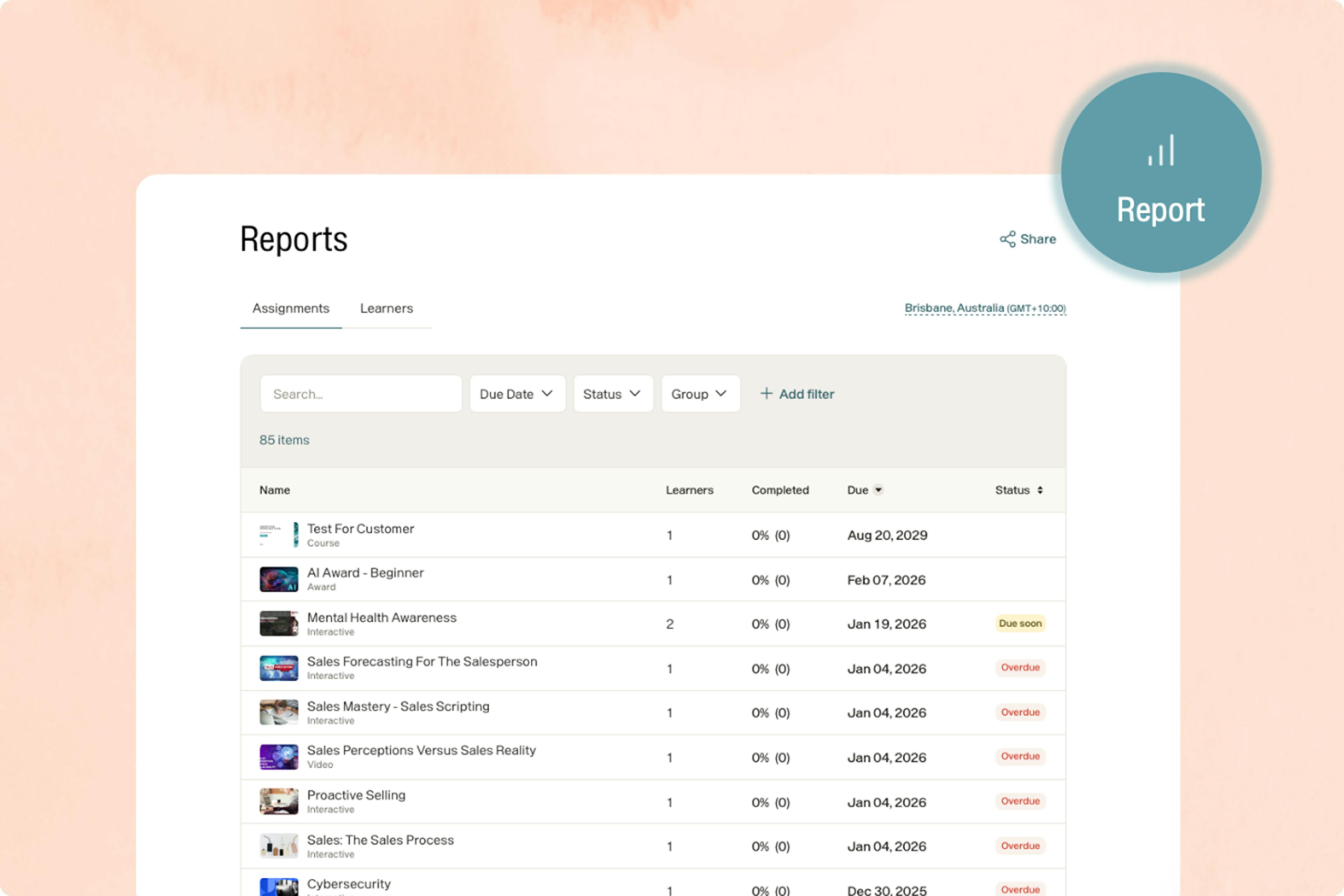 Report | Reporting | Admins can track assignment progress, spot overdue learners, and share clear reports—all directly in Go1 Learn - Learn how |