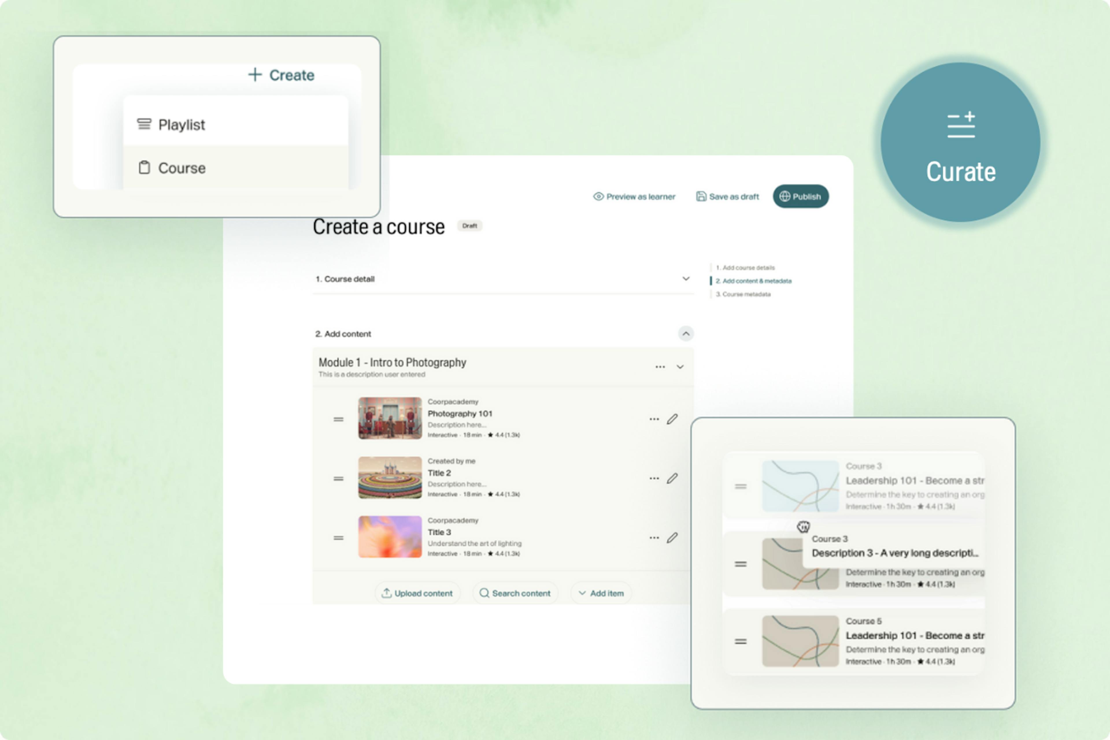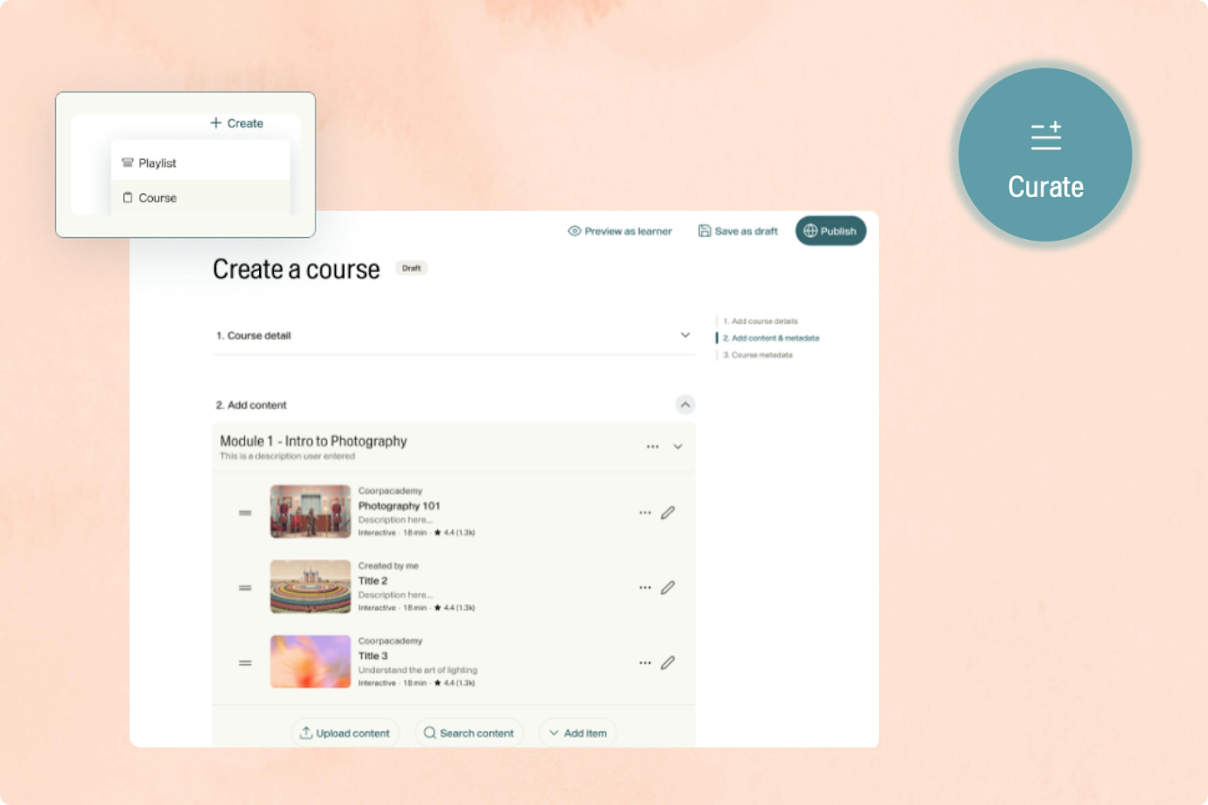 - Build courses faster - Use AI-powered search and filters to quickly find and add relevant modules as you create