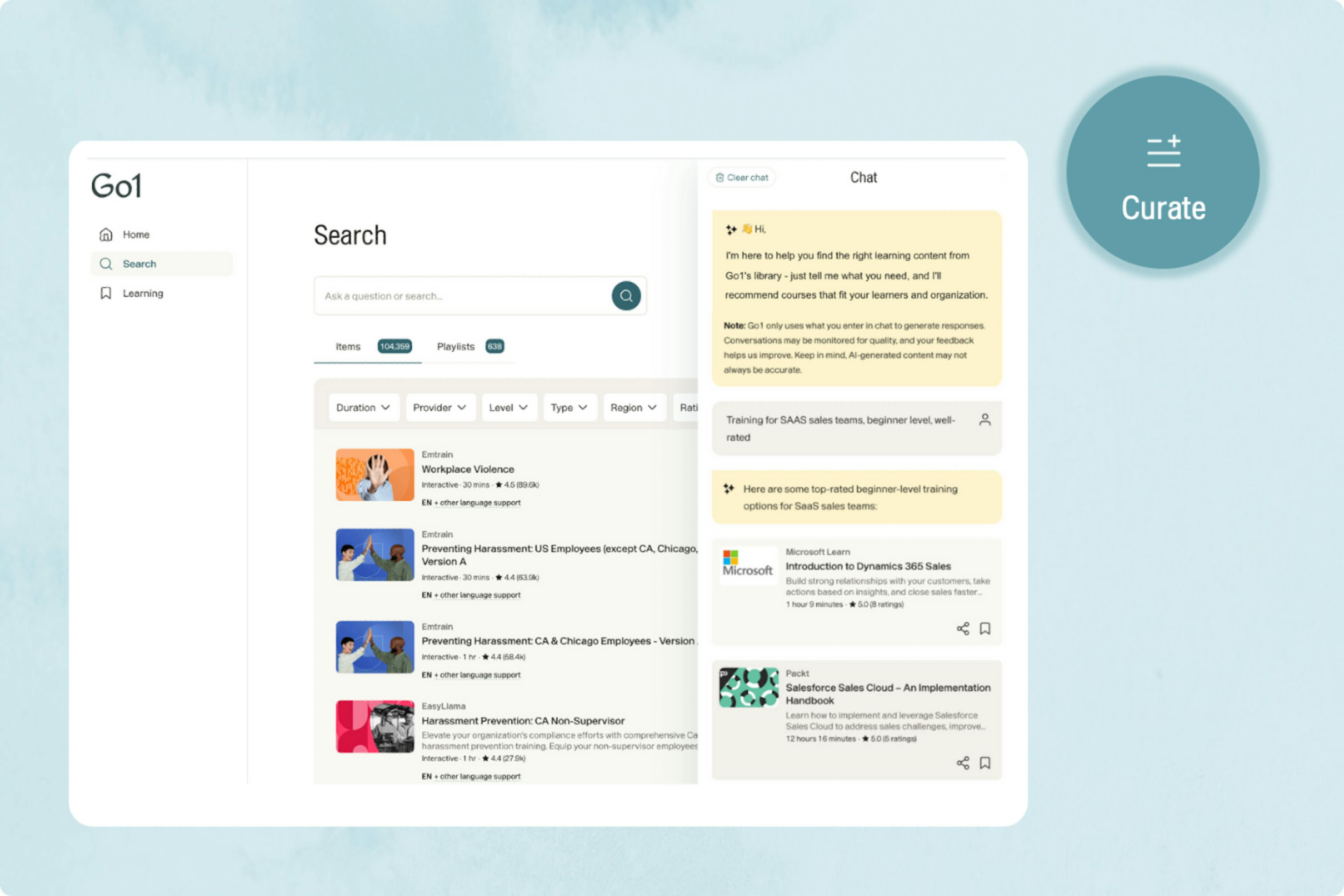 Set global preferences for providers and languages to tailor results while keeping Go1 open for discovery.